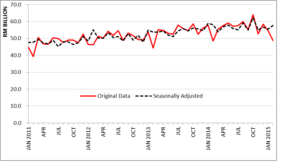 On a m-o-m basis seasonally adjusted terms, imports increased RM2.1 billion (+3.8%) to RM57.7 billion.