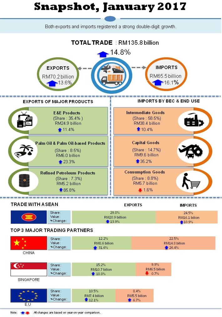 Total trade in January 2017 was valued at RM135.8 billion, an expansion of RM17.5 billion or 14.8% from a year ago. However it posted a decline of RM6.6 billion or 4.6% when compared to the previous month. A lower trade surplus of RM4.7 billion was recorded when compared to the previous year (-12.6%) as well as the previous month (-46.0%).
