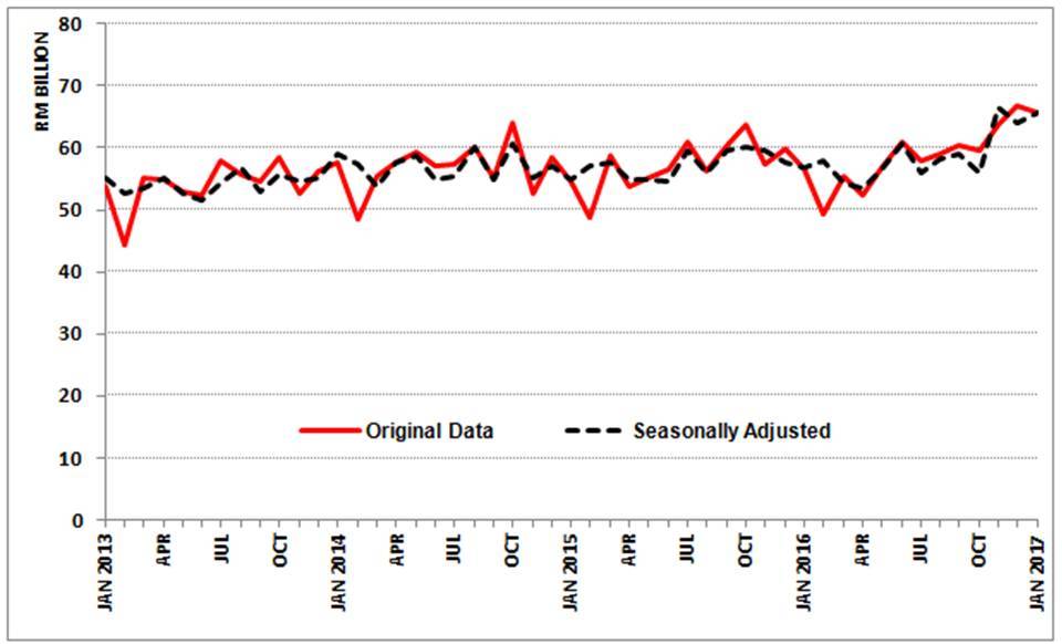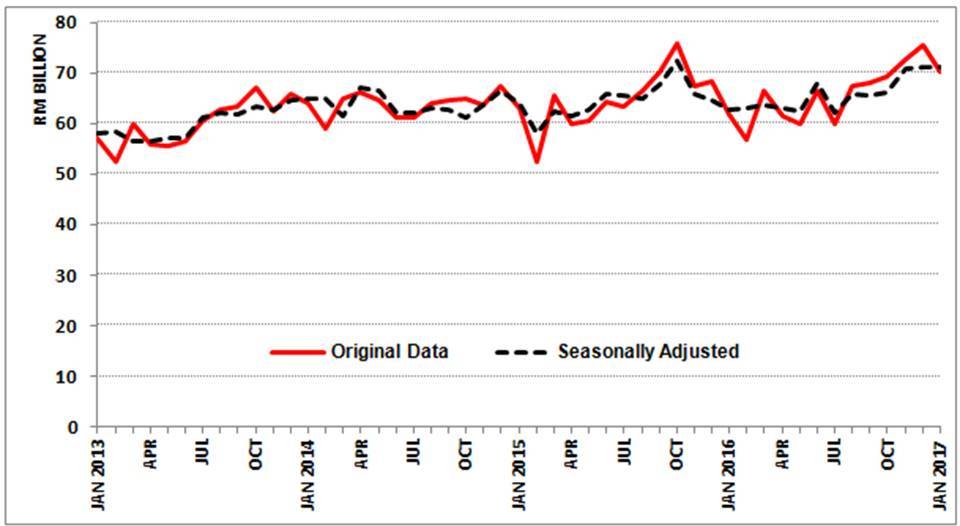 - On a m-o-m basis, imports also declined RM1.3 billion (-2.0%) from RM66.8 billion. However, imports increased 2.8% in seasonally adjusted terms.