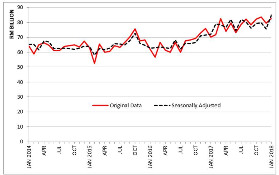- On a year-on-year (y-o-y) basis, exports registered a double-digit growth of 17.9% (+RM12.6 billion) to RM82.9 billion. Re-exports in January 2018 was valued at RM17.4 billion and accounted for 21.0% of total exports. Domestic exports grew RM5.6 billion (+9.3%) to RM65.5 billion.
