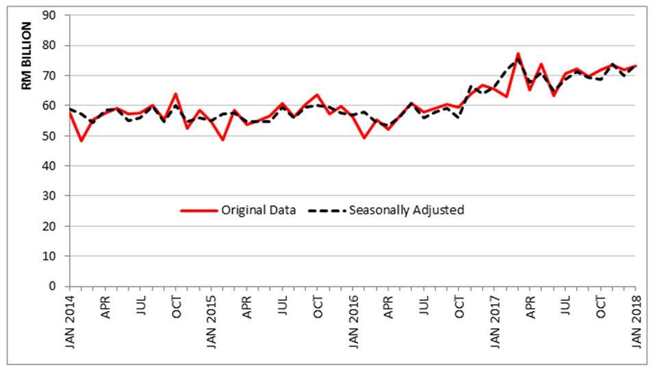 On a m-o-m basis seasonally adjusted terms, imports increased RM3.5 billion (+5.0%) to RM73.4 billion.