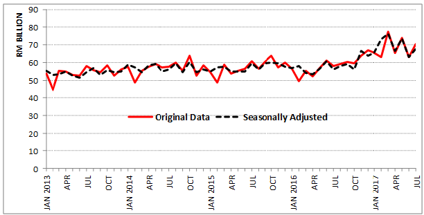 - Re-exports in July 2017 was valued at RM12.0 billion and accounted for 15.3% of total exports. Domestic exports was higher by RM14.2 billion (+27.0%) to register at RM66.6 billion.