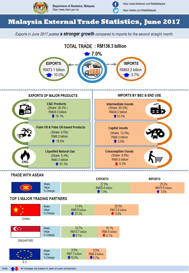 Total trade in June 2017 which was valued at RM136.3 billion grew RM8.9 billion or 7.0% from a year ago. However, it posted a decrease of RM17.1 billion or 11.1% when compared to the previous month. In June 2017, a trade surplus of RM9.9 billion was recorded, where a similar increase of RM4.4 billion or 79.0% for both y-o-y and m-o-m was registered.