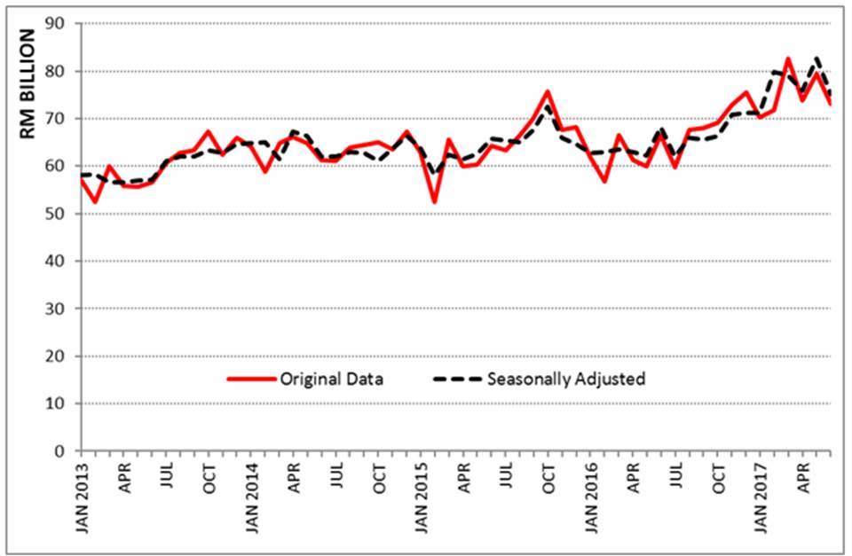 - On a year-on-year (y-o-y) basis, exports registered an increase of RM6.6 billion (+10.0%) to RM73.1 billion. Re-exports in June 2017 was valued at RM9.7 billion and accounted for 13.2% of total exports. Domestic exports was higher by RM7.6 billion (+13.6%) to register at RM63.4 billion.