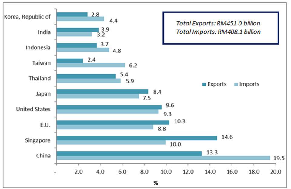 - On a y-o-y basis, exports increased due to the higher exports to China (+RM2.1 billion), Japan (+RM1.2 billion), Singapore (+RM893.0 million), European Union (+RM657.7 million) and Republic of Korea (+RM599.6 million).