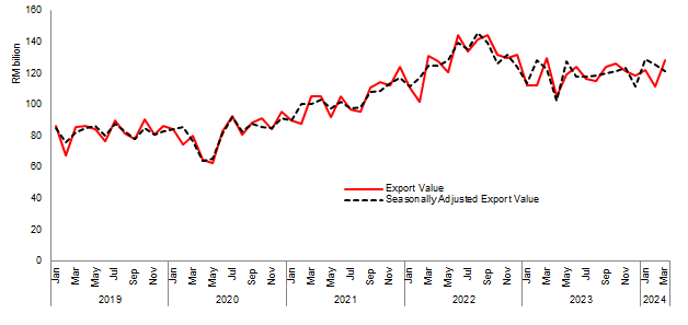 On a monthly comparison, exports expanded 15.5 per cent or RM17.3 billion. With regards to analysis of the seasonally adjusted terms month-on-month (m-o-m), exports reduced by 3.3 per cent to RM121.3 billion.