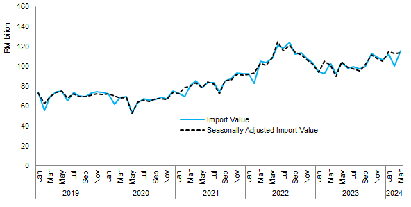 Malaysia's imports in March 2024 continued to expand by 12.5 per cent or RM12.9 billion, to post a value of RM115.8 billion as compared to March 2023. As compared to February 2024, imports increased by 15.7 per cent or RM15.7 billion. Analysis on seasonally adjusted terms, m-o-m, imports rose by 0.5 per cent to RM113.6 billion.
