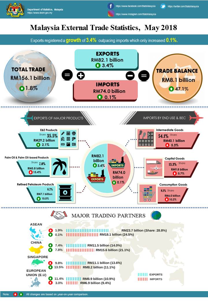 - Exports in May 2018 was valued at RM82.1 billion, continued to surpass the RM80.0 billion mark, increasing by 3.4% year-on-year (y-o-y). This is the 5th consecutive month where export growth has outpaced imports. Re-exports was valued at RM16.3 registering an increase of 21.4% y-o-y and accounted for 19.8% of total exports. Domestic exports was lower by 0.3% decreasing RM178.0 million to RM65.9 billion.
