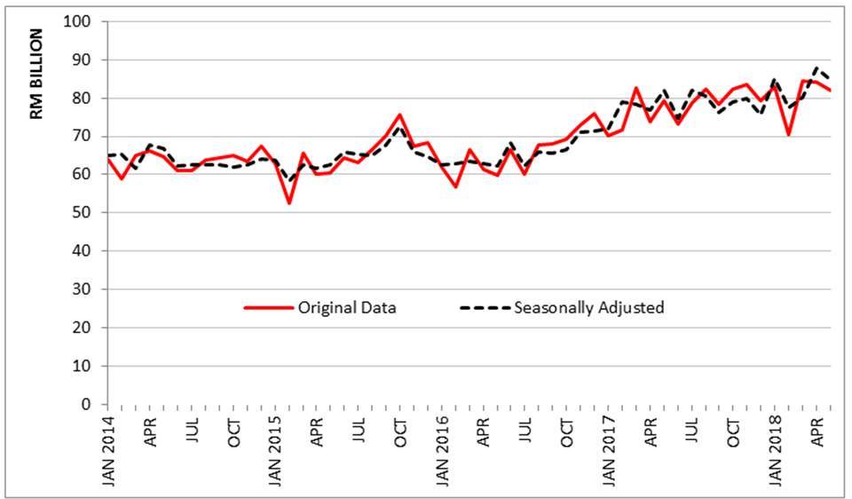 - On a m-o-m basis, imports posted a growth of 3.9% or RM2.8 billion from RM71.2 billion. However, in seasonally adjusted terms, imports decreased 1.7%.