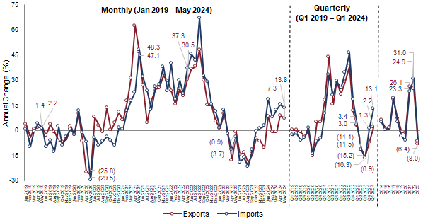 Malaysia's imports in May 2024 continued to grow by 13.8 per cent or RM14.3 billion, to post a value of RM118.1 billion as compared to May 2023. As compared to April 2024, imports strengthened by 10.4 per cent or RM11.1 billion. Analysis in seasonally adjusted terms, m-o-m, imports also rose by 15.0 per cent to RM120.1 billion.