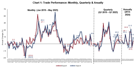 Malaysia's trade performance sustained a positive trend in May 2025, consistent with the rise in imports (+6.6%), year-on-year (y-o-y). Total trade increased by RM6.4 billion or 2.6 per cent, y-o-y, reached RM252.5 billion.
