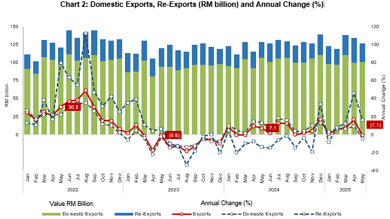 Malaysia’s exports decreased by 1.1 per cent in May 2025, down from RM128.0 billion in April 2024 to RM126.6 billion.