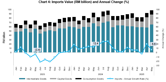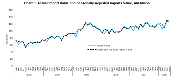 Malaysia's import value increased by 6.6 per cent, or RM7.8 billion to RM125.9 billion in May 2025. On a m-o-m basis, imports downed by 2.0 per cent or RM2.5 billion. According to the m-o-m seasonally adjusted terms analysis, imports decline 3.6 per cent to RM126.8 billion.