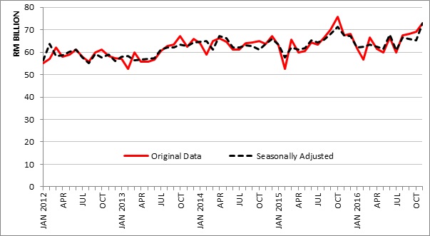 On a m-o-m basis seasonally adjusted terms, exports increased RM7.7 billion (+11.8%) to RM72.8 billion.