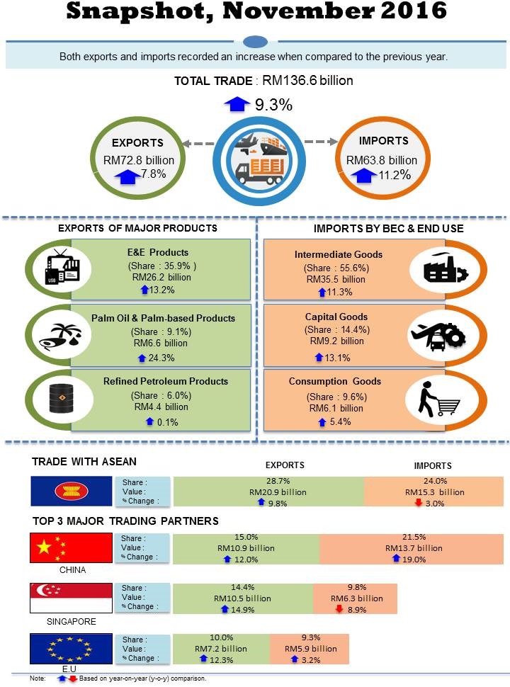 Total trade in November 2016, which was valued at RM136.6 billion, expanded RM11.7 billion (+9.3%) from a year ago. It posted an increase of RM8.0 billion or 6.2% from the previous month. A trade surplus of RM9.0 billion was recorded in November 2016, a decrease of 11.3% from RM10.2 billion registered a year ago. It also posted a decrease of RM726.0 million or 7.4% when compared with the previous month.
