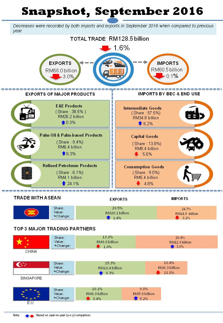 - On a year-on-year (y-o-y) basis, exports declined RM2.1 billion (-3.0%) to RM68.0 billion. Re-exports in September 2016 was valued at RM10.2 billion and accounted for 14.9% of total exports.