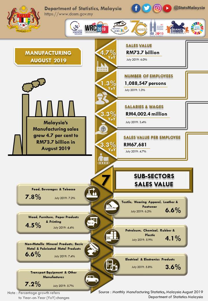 The full publication of the Monthly Manufacturing Statistics, August 2019 can be downloaded from eStatistik portal.