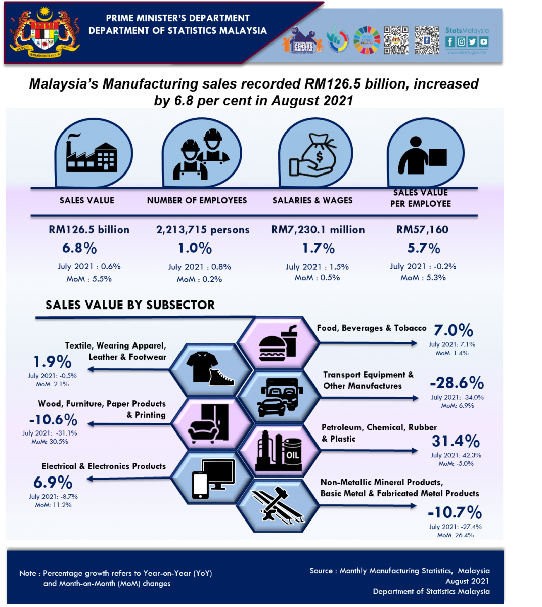 Malaysia’s Manufacturing sales recorded RM126.5 billion, increased by 6.8 per cent in August 2021