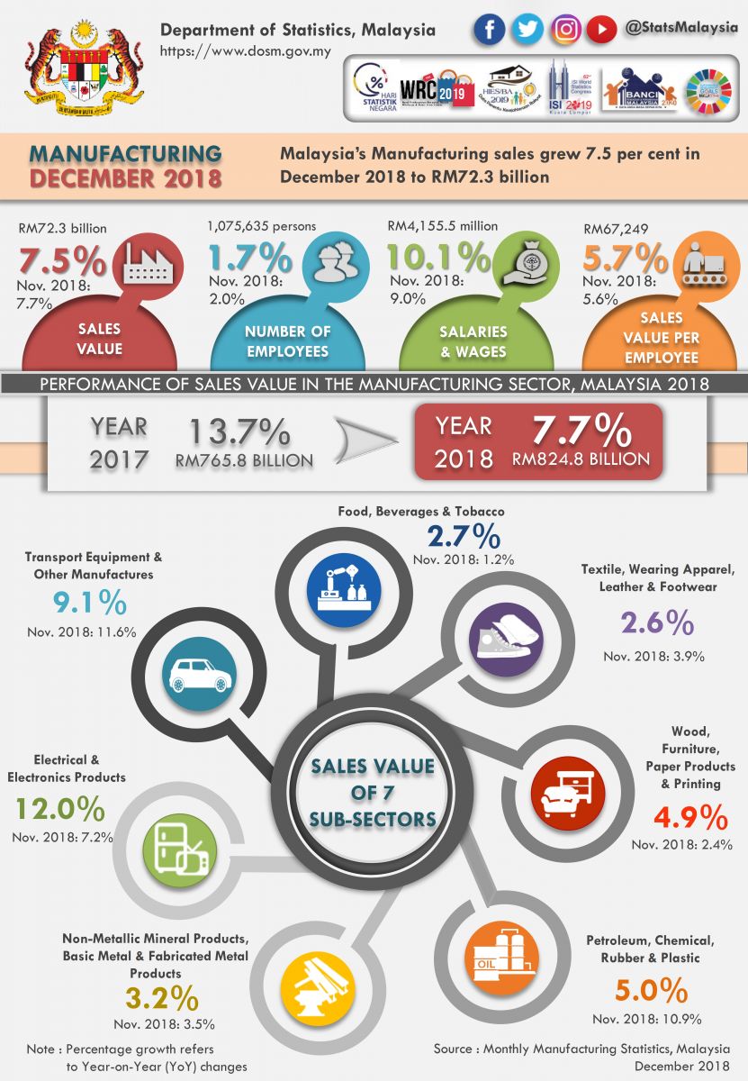 Malaysia’s Manufacturing sales grew 7.5 per cent in December 2018 to RM72.3 billion