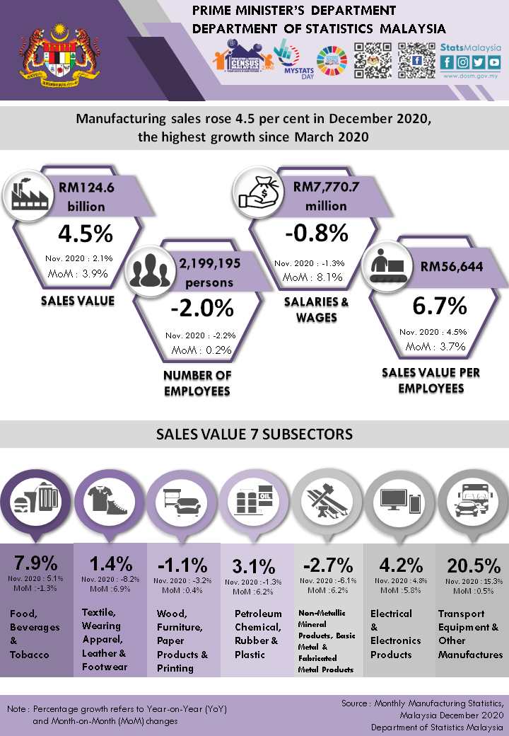 The full publication of the Monthly Manufacturing Statistics, December 2020 can be downloaded through eStatistik portal.