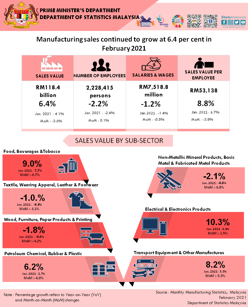 Malaysia’s Manufacturing sales in February 2021 stood at RM118.4 billion, grew 6.4 per cent as compared to previous year. The rise in sales value in February 2021 was driven by the increase in Electrical & Electronics Products (10.3%), Food, Beverages & Tobacco Products (9.0%) and Transport Equipment & Other Manufactures Products (8.2%). Meanwhile, on month-on-month basis, the sales value decreased 3.6 per cent.