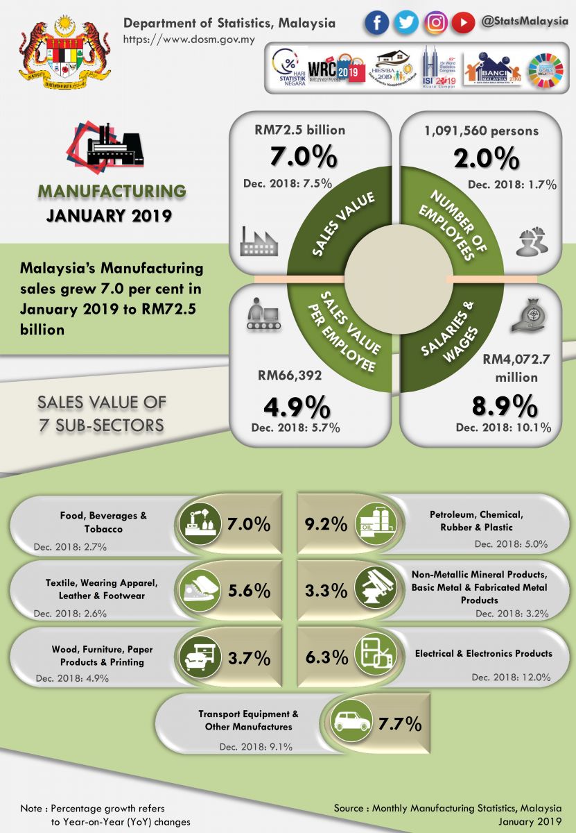 Malaysia’s Manufacturing sales grew 7.0 per cent in January 2019 to RM72.5 billion