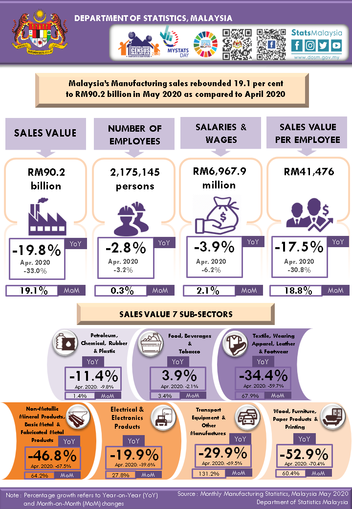 The full publication of the Monthly Manufacturing Statistics, May 2020 can be downloaded through eStatistik portal.
