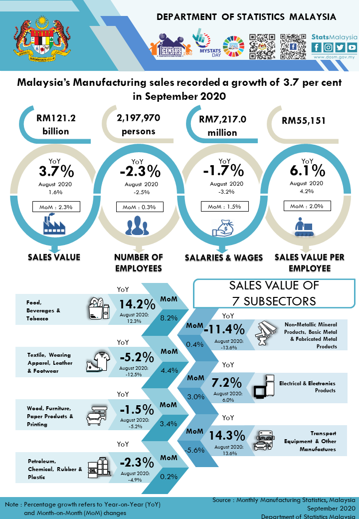 The full publication of the Monthly Manufacturing Statistics, September 2020 can be downloaded through eStatistik portal.