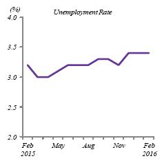 Unemployment rate was 3.4% The unemployment rate for February 2016 was 3.4 per cent, similar to January 2016. Year-on-year comparison showed that the unemployment rate rose by 0.2 percentage points. Meanwhile the seasonally adjusted unemployment rate was 3.2 per cent, same as was recorded in the previous month.