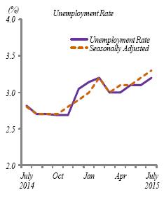 Unemployment rate was 3.2% The unemployment rate increased 0.1 percentage points to 3.2 per cent in July 2015 compared to the previous month. Meanwhile, year-on-year comparison showed that the unemployment rate was increased by 0.4 percentage points. The seasonally adjusted unemployment rate was 3.3 per cent, increased by 0.1 percentage points compared to the previous month.