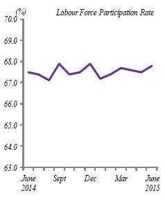 Labour force participation rate increased to 67.8% Labour force participation rate for June 2015 increased by 0.3 percentage points to 67.8 per cent as compared to the previous month. This increase was contributed by the increase of 0.5 per cent employed persons in the labour market. Year-on-year comparison showed that the labour force participation rate increased by 0.3 percentage points as compared to 67.5 per cent in June 2014.