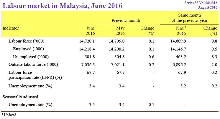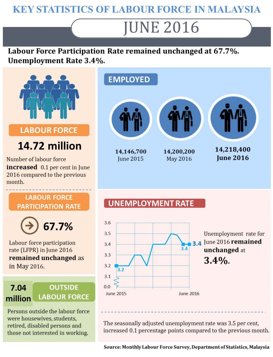 Monthly Principal Statistics of Labour Force, Malaysia, June 2016