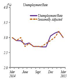 Unemployment rate declined to 3.0% The unemployment rate in March 2015 was 3.0 per cent, declined by 0.2 percentage point as compared to the previous month. The decrease was due to the reduction of an unemployment by 24,100 persons during the period. Year-on-year comparison showed that the unemployment rate remained at 3.0 per cent as registered in March 2014. The seasonally adjusted unemployment rate also remained at the same rate, 3.0 per cent.