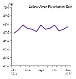 Labour force participation rate increased to 67.7% Labour force participation rate for March 2015 was 67.7 per cent, increased by 0.3 percentage point as compared to previous month. The increase is due to the rise in employed persons in the labour market by 0.7 per cent to 13.8 million persons. Year-on-year comparison showed that the labour force participation rate was higher by 0.8 percentage point than 66.9 per cent recorded in March 2014.