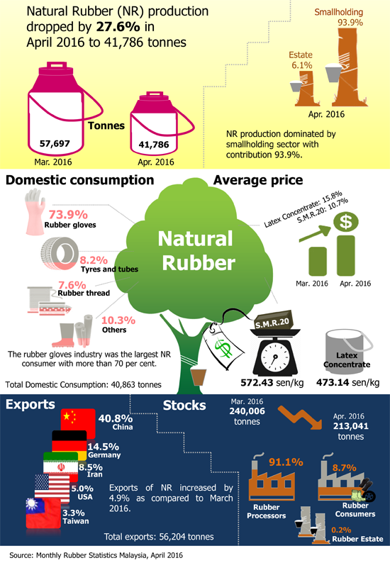 Natural rubber (NR) production dropped by 27.6 per cent in April 2016 to 41,786 tonnes compared to March 2016. Smallholding sector is the main contributor of NR production which is more than 90 per cent.