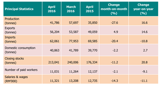 Meanwhile, domestic consumption of NR in April 2016 decreased by 2.2 per cent to 40,863 tonnes from previous month. Nevertheless, year-on-year comparison showed an increased by 2.7 per cent. The rubber gloves industry remain as main domestic consumption with more than 70 per cent.