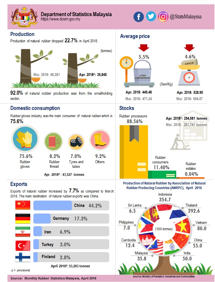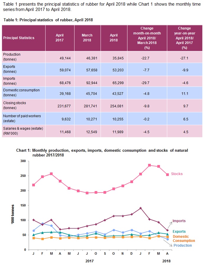 Domestic consumption of natural rubber also declined by 4.8 per cent in April 2018 to 43,527 tonnes. Natural rubber is widely used in the rubber glove industry with consumption of 32,893 tonnes or 75.6 per cent of the total natural rubber domestic consumption.