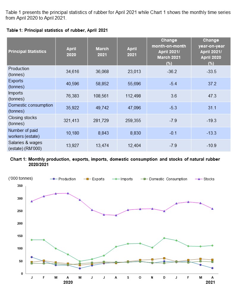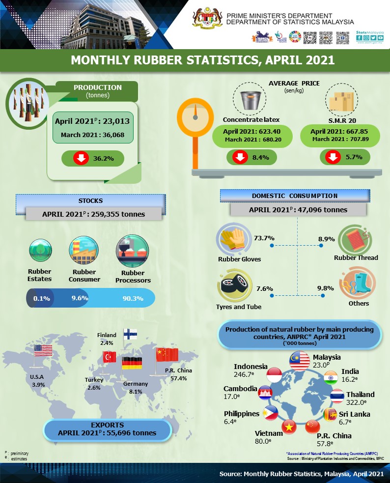 The full publication of the Monthly Rubber Statistics, April 2021 can be downloaded through eStatistik Portal.