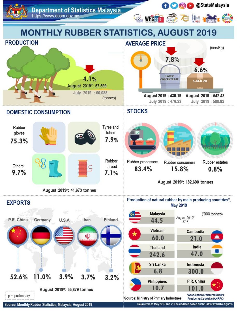 Total domestic consumption of natural rubber was 41,673 tonnes, decreased 0.3 per cent against 41,796 tonnes as reported in July 2019. Natural rubber is widely used in the rubber glove industry with 31,394 tonnes or 75.3 per cent of the total domestic consumption.