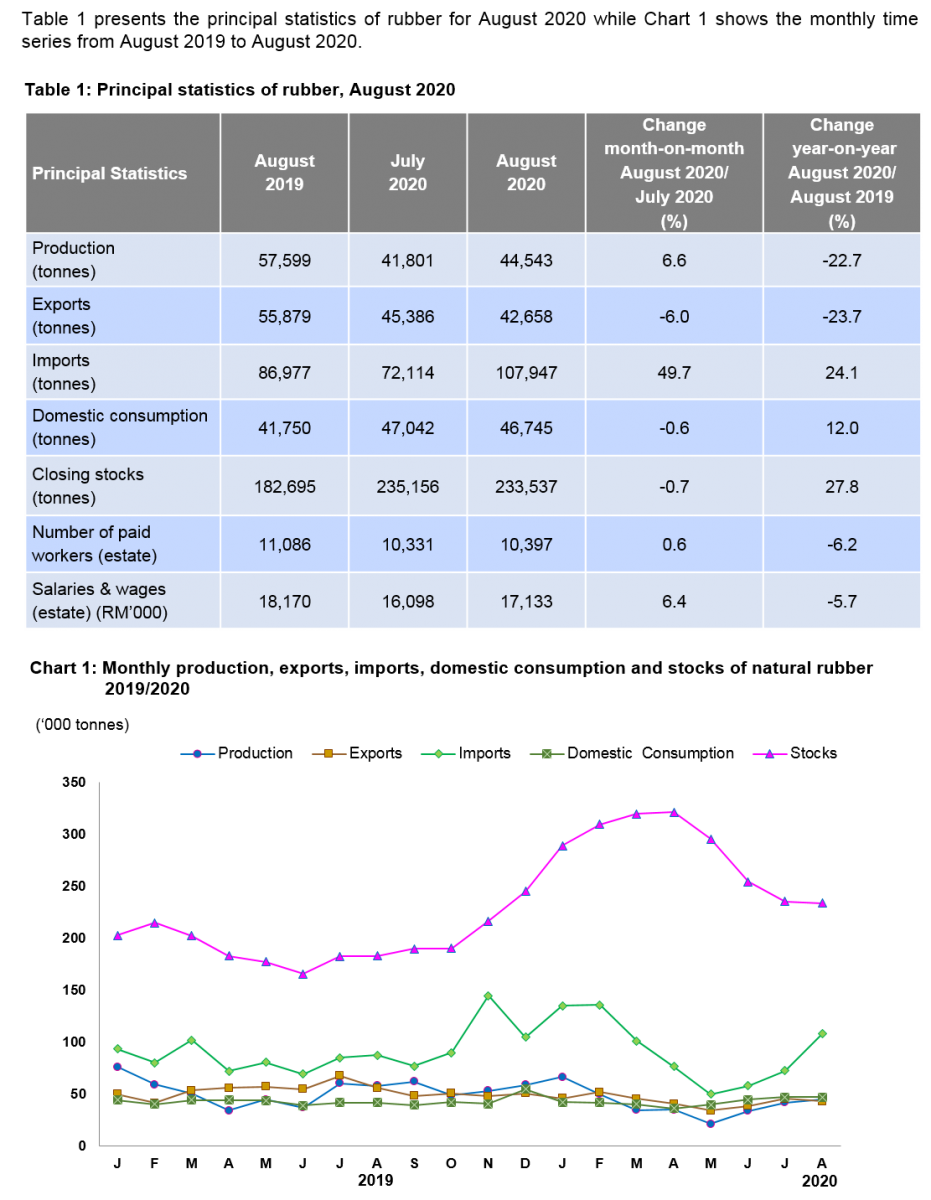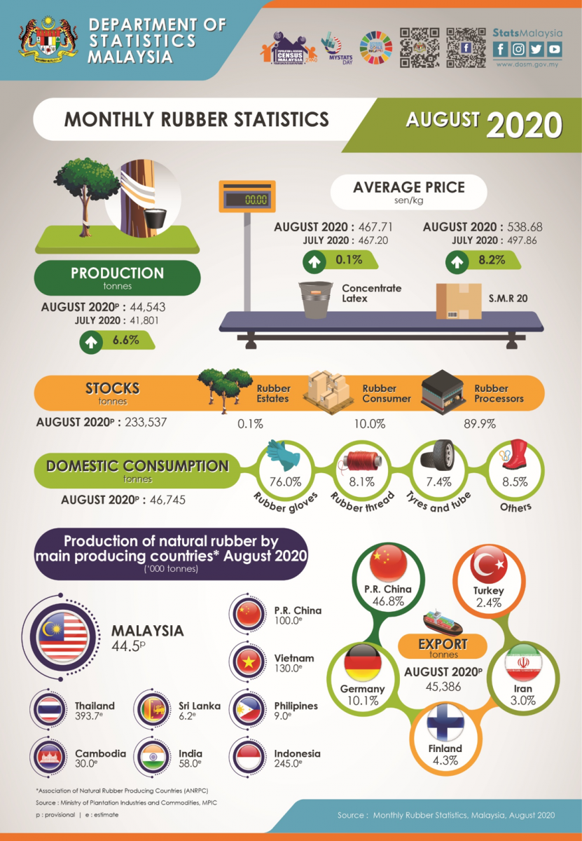 Production of natural rubber increased 6.6 per cent in August 2020 to 44,543 tonnes as compared to 41,801 tonnes in the previous month. Comparison year on year showed a decrease of 22.7 per cent as compared to the same month in the previous year.