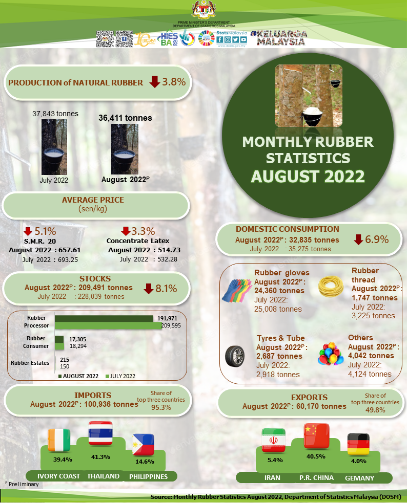 The full publication of the Monthly Rubber Statistics, August 2022 can be downloaded through eStatistik portal.