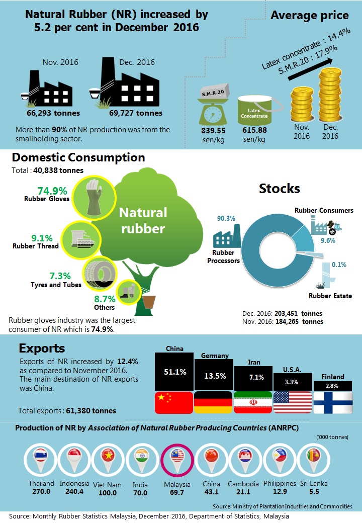 Natural rubber (NR) production increased by 5.2 per cent in December 2016 to 69,727 tonnes as compared to November 2016. The main contributor of NR production is from smallholding sector with 92.9 per cent.