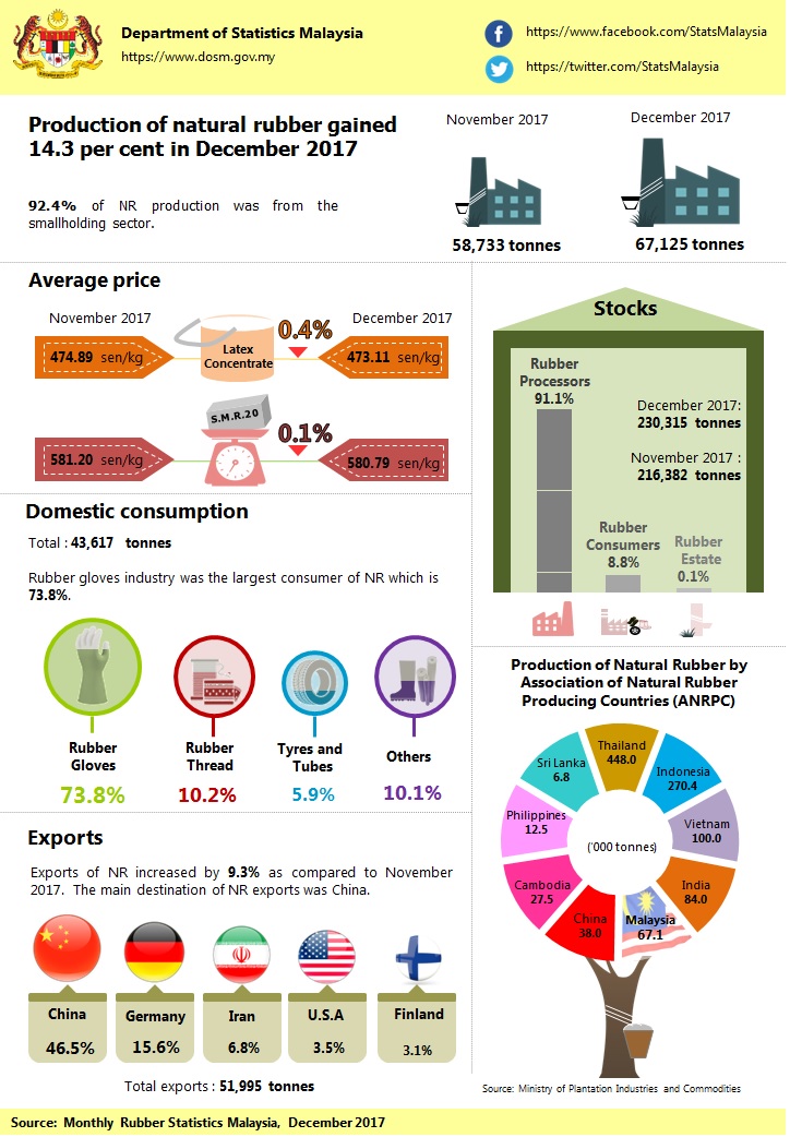 Natural rubber (NR) production gained by 14.3 per cent in December 2017 to 67,125 tonnes as compared to November 2017. Smallholding sector remained as the main contributor of NR production which is more than 90 per cent.