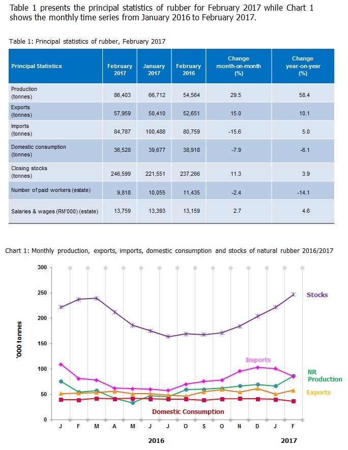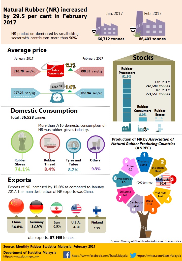 Production of NR in February 2017 increased by 29.5 percent to 86,403 tonnes as compared to previous month. The main contributor of NR production is from smallholding sector which is more than 90 per cent.