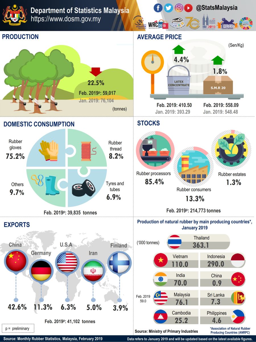 Malaysia’s natural rubber production in February 2019 was 59,017 tonnes, a decrease of 6.7 per cent as compared to February 2018. Month-on-month comparison showed the production of natural rubber declined by 22.5 per cent from 76,104 tonnes in January 2019.