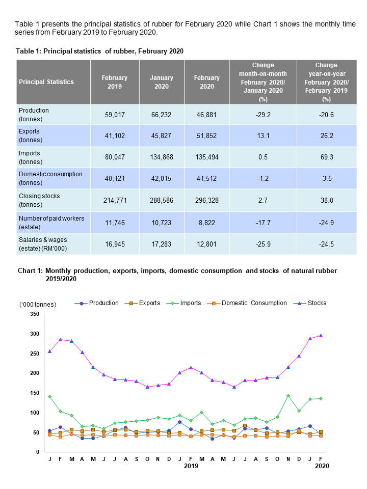 The Monthly Rubber Census for reference February 2020 was conducted in March 2020, prior to the announcement of the Movement Control Order (MCO). Activities of collecting statistics in the industry especially on production was not affected after the MCO's announcement during that period.