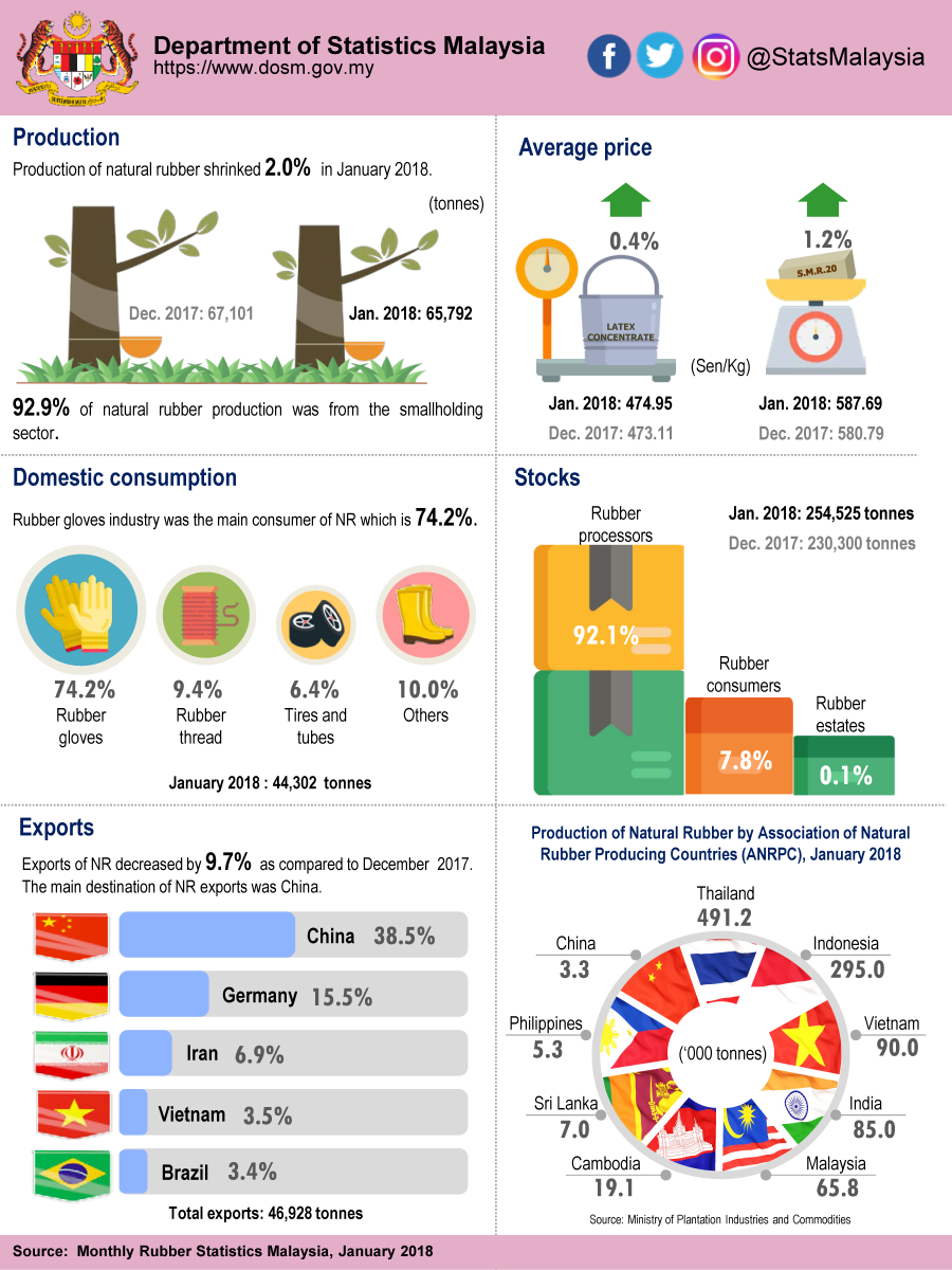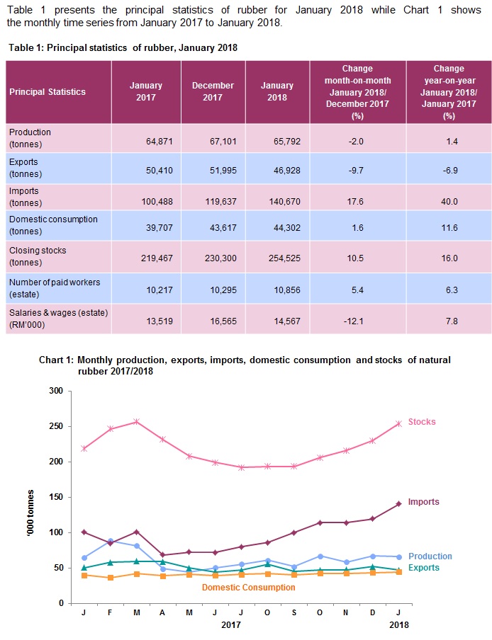 Natural rubber production shrinked by 2.0 per cent in January 2018 to 65,792 tonnes as compared to December 2017. Meanwhile for year-on-year comparison showed an increase of 1.4 per cent in January 2018 compared to January 2017.
