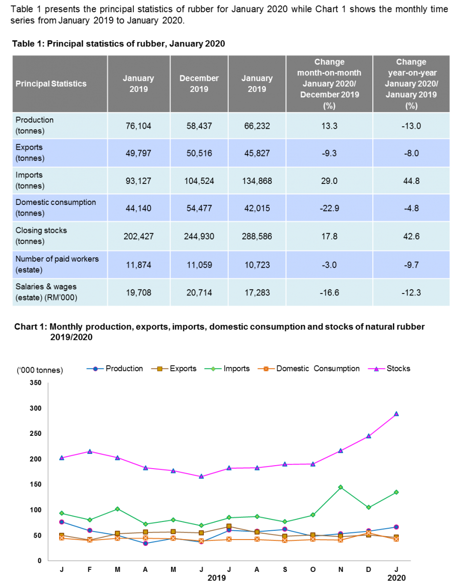 Stocks of natural rubber in January 2020 was 288,586 tonnes as compared to 245,002 tonnes in December 2019, an increase of 17.8 per cent.