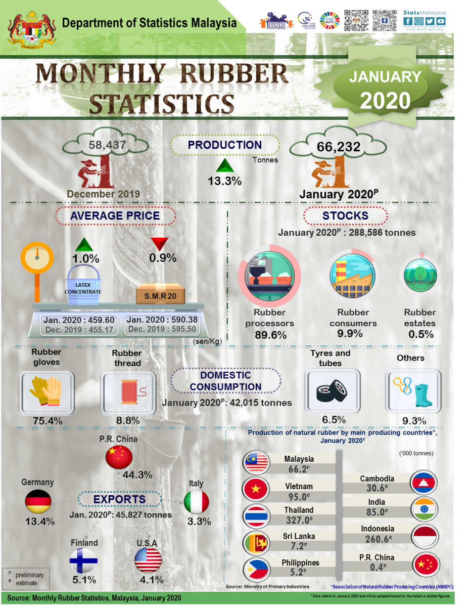 Malaysia's natural rubber production increased 13.3 per cent in January 2020 to 66,232 tonnes as compared to the previous month. Meanwhile comparison year on year showed a decrease of 13.0 per cent as compared to the same month in the previous year.