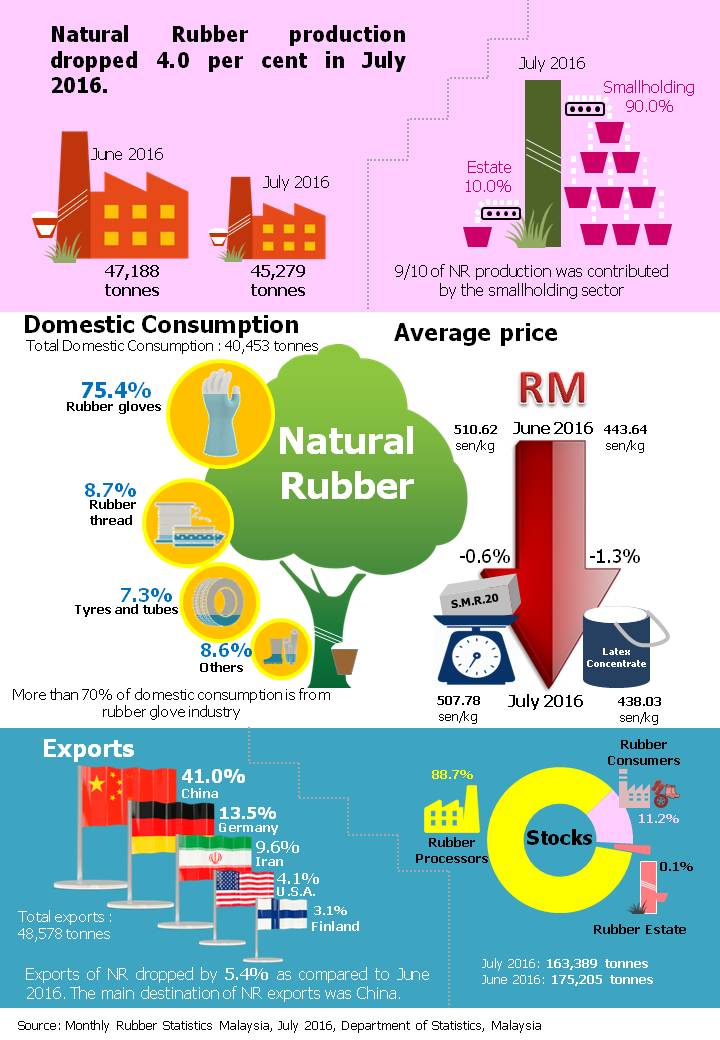 In July 2016, natural rubber (NR) production dropped by 4.0 per cent to 45,279 tonnes as compared to June 2016. 90.0 per cent of NR production was contributed by the smallholding sector.